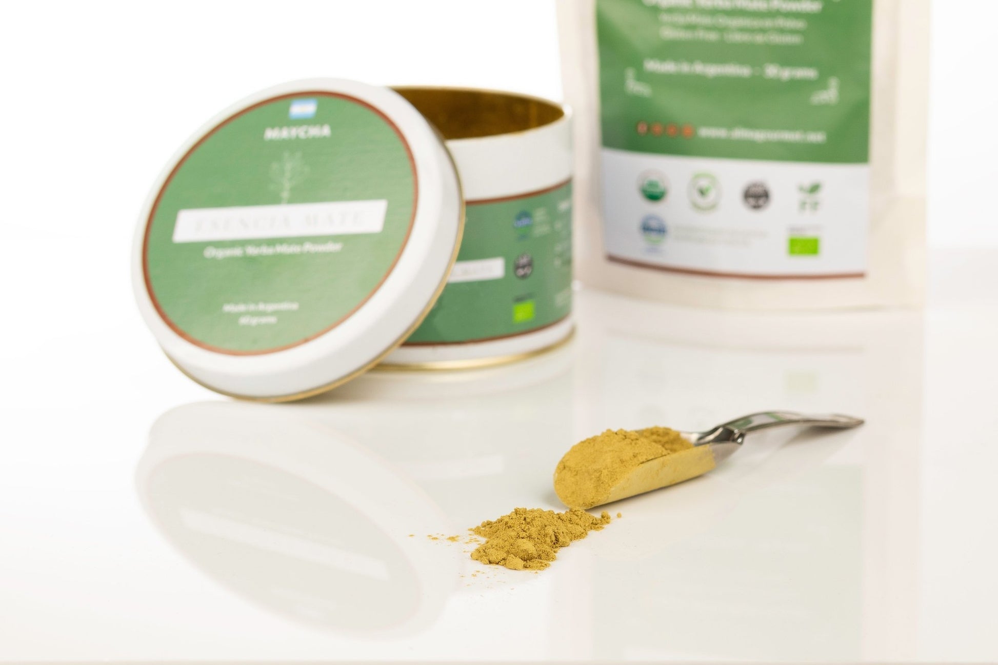Esencia Mate (poudre bio) — Poudre type matcha par Karla Johan : 1 g suffit ; très riche en antioxydants, usage boisson & cuisine.