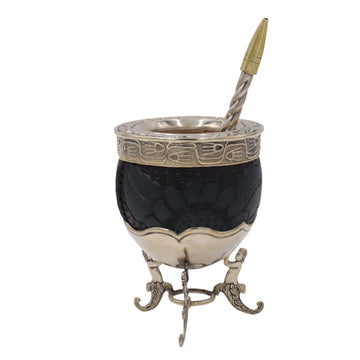 Mate « Dieu Neptune » noir sur trépied, bombilla torsadée, virole en alpaca ciselée.