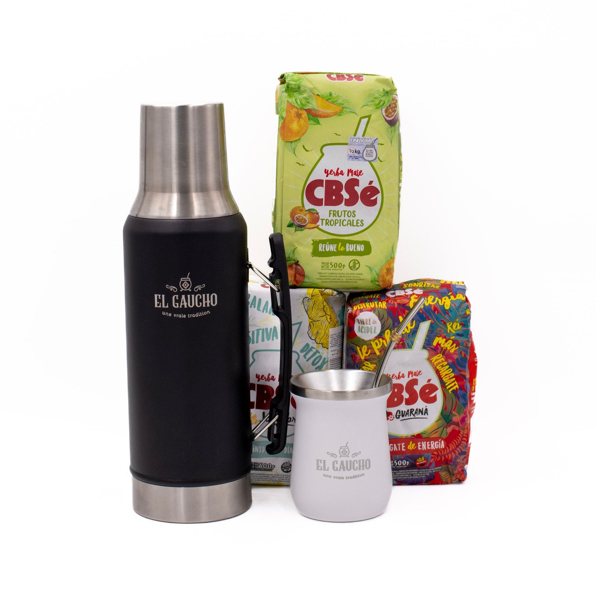Pack Essentiel Maté : thermos Gaucho Tradition, maté au choix (Inox ou Élite) avec bombilla inox, + 3 yerbas CBSe 500 g. Kit complet pour débuter et vivre le rituel authentique dès la première gorgée. Thermos noir par défaut, blanc sur demande.