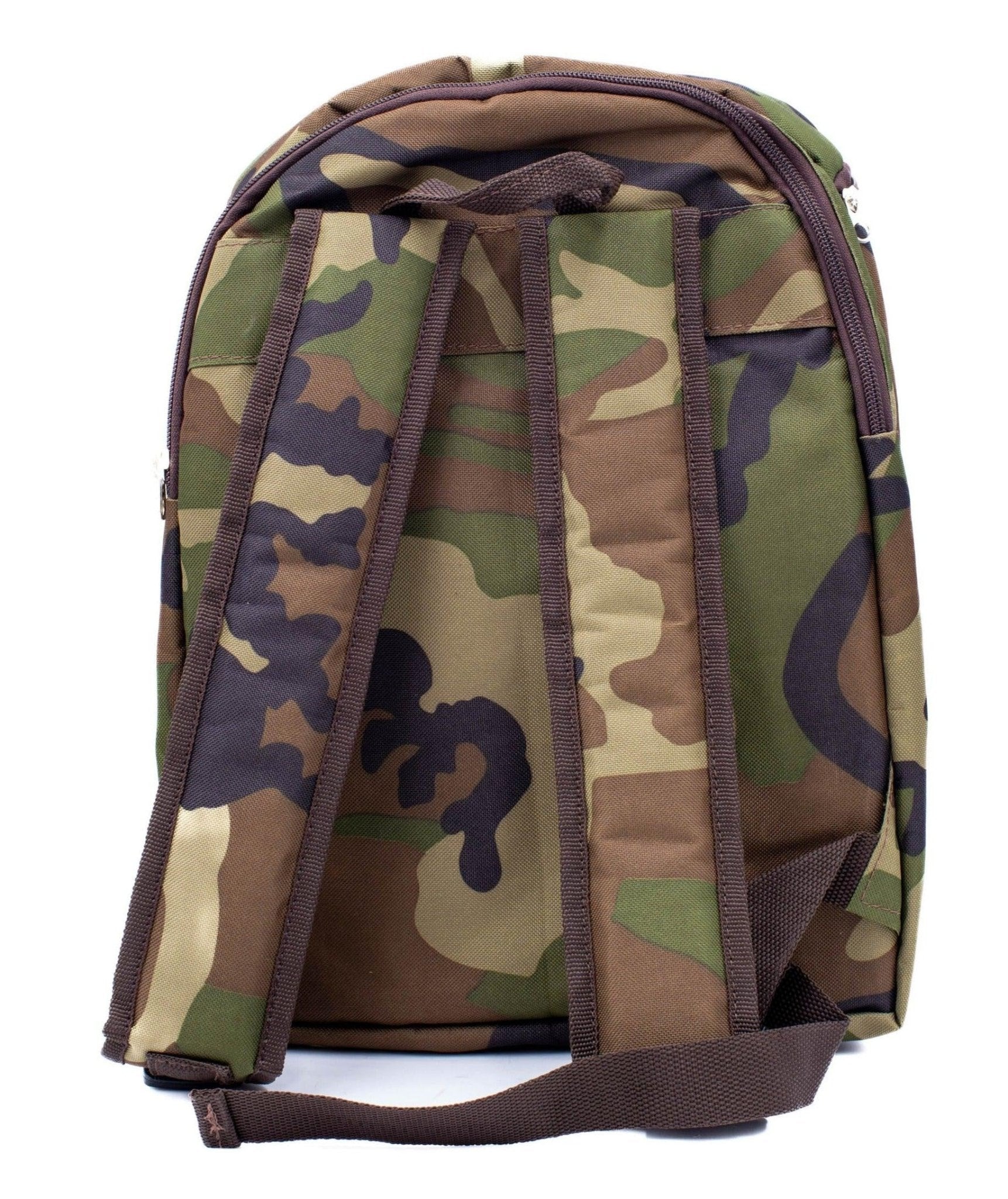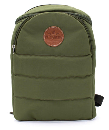 Sac à dos Sport El Gaucho : tissu imperméable, dos/bretelles rembourrés, compartiments pour thermos, calebasse, yerba, bombilla et PC. 40 × 33 cm, coloris noir/kaki/camo. Sac uniquement.